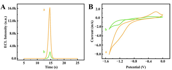 In addition, ECL and CV analyses were employed to inspect the above speculation. Figure 6A demonstrates that CPH had a strong quenching effect on the ECL signal of this system. Figure 6B shows the CV behaviors with/without CPH in the detection solution. Compared with the CV curve without CPH (curve a), the reduction peak current of the CV curve containing CPH in the solution (curve b) was weakened, which further indicated that •CPH consumes large amounts of SO4•− [53]. In summary, SO4•− does react with CPH, thus hindering the emission recombination of electron–hole trapped on the surface of g-C3N4, leading to the ECL quenching of the g-C3N4/S2O82−/CdS@Co/Mo-MOF system. The process could be described by Equations (9)–(15).