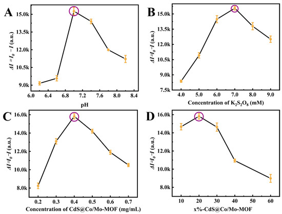 Effect of different experimental conditions on the response signals: (A) pH, (B) the concentration of K2S2O8, (C) the concentration of CdS@Co/Mo-MOF, and (D) x%-CdS@Co/Mo-MOF. Error bars: SD, n = 3.