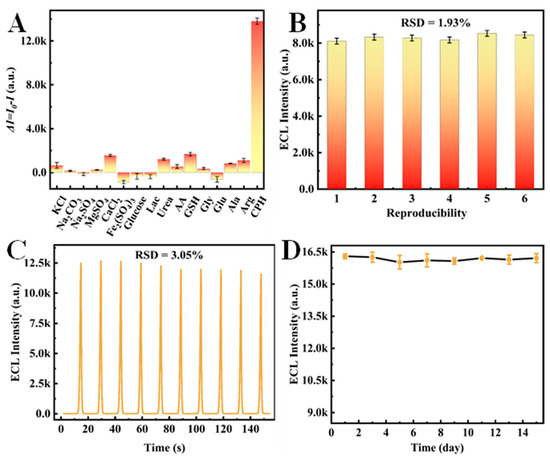 To evaluate the selectivity of the ECL sensor, several interferences including metal ion compounds, amino acids, and biomolecules (i.e., KCl, Na2CO3, Na2SO4, MgSO4, CaCl2, Fe2(SO4)3, Glucose, Urea, Lactose, Arg, Glu, Gly, Ala, GSH and AA) were investigated under the same conditions (Figure 9A). Among them, the ECL responses in the presence and absence of interferences/CPH in the detection solution were expressed as I and I0, respectively, and the difference in quenching intensity was denoted by ΔI (ΔI = I0 − I). As presented in Figure 9A, compared with CPH (0.1 mM), the influence of these interferents (1.0 mM) on the ECL signal of the sensor was negligible, indicating that the sensor had good selectivity. Equally, the repeatability of the sensor was explored. Under the same conditions, six different modified electrodes were employed to determine 0.01 μM CPH (Figure 9B), and the relative standard deviation (RSD) was 1.93%, suggesting that the designed sensor has favorable reproducibility. Moreover, the stability of the biosensor was estimated under consecutive tests in the detection solution containing 0.1 nM CPH. As demonstrated in Figure 9C, the ECL signal was relatively stable, and the RSD was calculated to be 3.05%. Finally, the ECL signal probe (g-C3N4/CdS@Co/Mo-MOF) was dispersed in ultrapure water and recorded its ECL emission for 15 consecutive days to determine the water stability of CdS@Co/Mo-MOF (Figure 9D). Notably, the ECL intensity of this probe remained within a certain range, which suggested that the signal amplification of CdS@Co/Mo-MOF did not change significantly within 15 days in aqueous solution. To a certain extent, it showed that CdS@Co/Mo-MOF has good water stability.