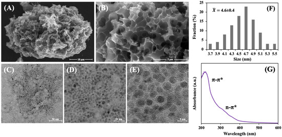 Figure 2C–E displays typical FE-TEM images of GQDs, while Figure 2F presents the diameter distributions of GQDs. Within the range of 3.7 to 5.5 nm, the GQDs exhibited uniform diameters, with an average diameter of 4.6 ± 0.4 nm. Figure 2G displays the UV–vis spectrum of the GQDs. A typical absorption peak was observed, and it contained both the π-π* and the n-π* structures. As a result of the aromatic sp2 hybridized carbon atoms, the π-π* bonds were attributed to the C=C bonds, while the n-π* bonds were attributed to the oxygen present in the GQDs [37,38].