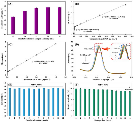 The influence of varying concentrations on the immunosensor’s performance was examined by incubating the immunoelectrode with Anti-PSA in concentrations ranging from 5.0 to 50.0 μg mL−1 at 4 °C for 12 h. The antibody was subsequently immobilized by incubating it with 1.0% BSA for 60 min. The immunoelectrode was washed with PB and used to detect PSA at a range of concentrations, including 0.2, 0.4, 0.6, 0.8, and 1.0 ng mL−1, using DPV in a solution of 5.0 mmol L−1 [Fe(CN)6]3−/4− with 0.10 mol L−1 KCl (Figure 4C). The sensitivity of the immunosensor increased as the antibody concentration increased from 5.0 to 40.0 μg mL−1, then reached a plateau after further increments of Anti-PSA concentration. The saturation of binding between Anti-PSA and the surface of the immunoelectrode described the result obtained.
