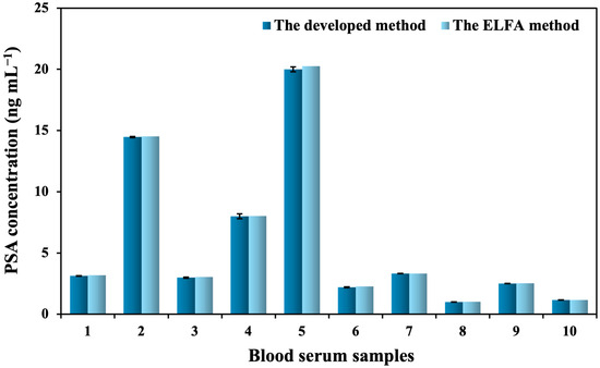 In order to identify the presence of PSA in serum samples, a volume of 2.0 µL of sample was carefully transferred onto the BSA/Anti-PSA/PTH/GQD/MG/SPE and then incubated for a duration of 30 min at room temperature. After 30 min, the PSA/BSA/Anti-PSA/PTH/GQD/MG/SPE was rinsed with 0.1 mol L−1 of PB (pH 7.4), and PSA was determined by DPV. The concentration of PSA that was determined using the developed method in ten serum samples was compared with the reference values that were obtained from the hospital using the ELFA. This comparison was carried out using a paired t-test. The results of the two methods were found to be in good agreement, providing a high level of confidence in the accuracy of the developed method (Figure 6).