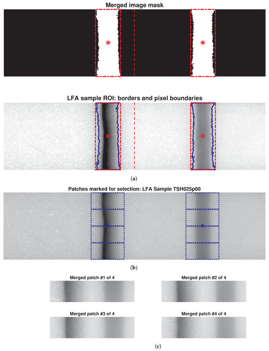 (a) Merged binary masks of segmented halves with bounding boxes (red lines) marking the ROIs, and LFA sample overlaid on marked binary masks. (b) Patch creation: 500-by-128 pixel LFA image sample; (c) four 128-by-32 pixel patches extracted from ROIs and merged.