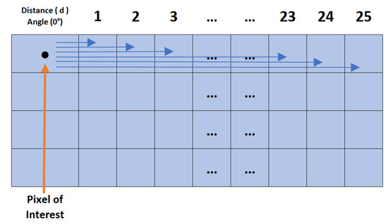 AHMO-GLCM process: GLCM computation at 0 degrees offset with pixel pairs separated by distances d = 1 to 25.