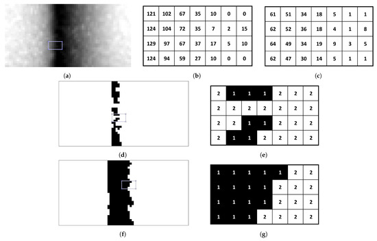 Quantisation: (a) split LFA patch and selective sub-patch from test line. (b) Pixel values of selected sub-region. (c) 64-level quantised sub-patch, capturing intensity variation. Quantised binary patch images: (d,e) 8-level binarised split patch and sub-patch pixel values. (f,g) 64-level binarised split patch and sub-patch pixel values.