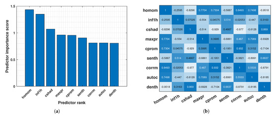 (a) Ranking of key texture features based on AHMO−GLCM properties. (b) Heatmap of AHMO−GLCM feature correlations.