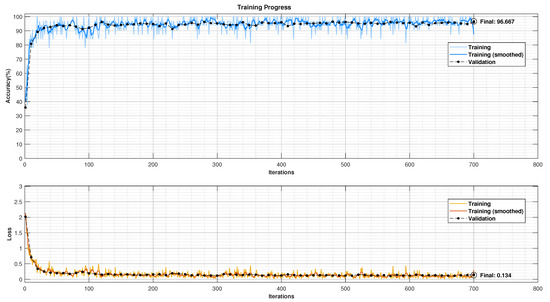 The CNN model was trained using Stochastic Gradient Descent with Momentum (SGDM) to optimise the model’s performance. Specific training parameters were chosen to balance learning and prevent overfitting. These included a learning rate of 0.01, a maximum of 10 epochs, and a mini-batch size of 32 patch images. Additionally, the data were shuffled before each epoch to expose the model to the training data in different orders, improving robustness. The model’s performance on unseen data was monitored throughout training using a 15% validation set. This validation split helps to identify potential overfitting where the model performs well on training data but poorly on unseen data. The achieved validation accuracy was 96.67%, visualised in Figure 8.