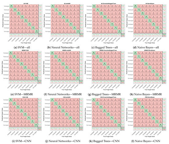 AHMO-GLCM features: confusion matrices comparing classifiers trained on (a–d) with all features; (e–h) with MRMR-based top-ranked features; (i–l) with CNN-derived features.