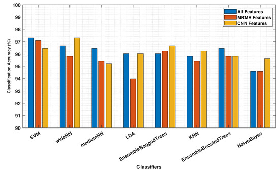 Classification accuracy comparison using all features, top MRMR features, and CNN-derived features from AHMO-GLCM features data.
