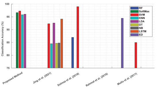 Comparison of classification accuracies: proposed textural features method vs. previous approaches (RF: random forest; LSTM: long short-term memory; ED: Euclidean distance) [53,54,55,56].
