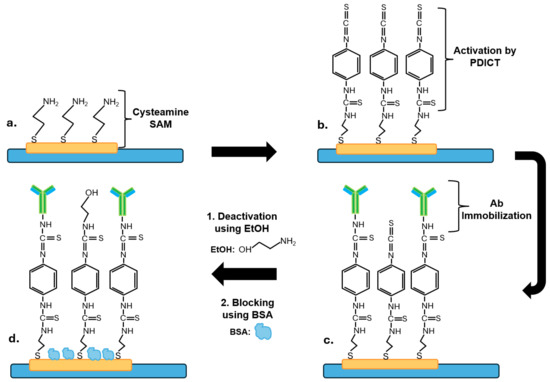 A scheme for the preparation of the biosensors (not at scale). (a) Formation of a cysteamine SAM on the gold working electrode; (b) activation of amino groups of the SAM using PDICT; (c) covalent immobilization of anti-CEA or anti-NSE monoclonal antibodies; (d) deactivation of unreacted thiocyanate functional groups using EtOH followed by the blocking of sensor’s surface by BSA.