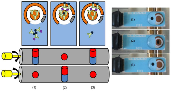 A scheme of the immunosensors platform is shown on the left. The photoshoots on the right show the movements of the MB; after capturing the analyte with functionalized MBs, these were added to the non-sensing area of SPGE, where the platform magnet was perpendicular to the electrode (1). The rotation of magnetic cylinders causes movement of MBs to the WE for analyte detection (2) and pull back the unbounded MB from the WE (3).