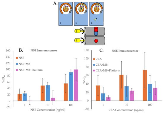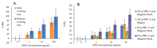 Figure 4B shows that washing the MB–Ab–analyte complex with 50 µL of PBS for 5 times (green bar) resulted in the lowest sensor signals with the smallest error bars in comparison with the other types of washing methods. Applying a washing step 5 times is likely to start removing the analyte bound to the MB–Ab, decreasing the overall immunosensor’s response. This is also confirmed by the fact that the highest signals were obtained when washing the MB–Ab–analyte with the smallest volume, 50 µL of PBS, for only 3 times. Similarly, when washings were performed with 100 µL of PBS, lower %∆Ret values were obtained in comparison with 50 µL of PBS, confirming that the higher volume of washing solution starts removing the analyte from the MB–Ab. Figure 4B also shows that similar error bars were obtained for all types of washings except when using 50 µL of PBS for 5 times, although this generated the lowest sensor signal. However, the lowest coefficients of variation (%CV) were obtained when washing was performed with 50 µL of PBS for 3 times. This also produced the highest sensor response, especially when using a magnetic rack rather than a single magnet for the isolation of the MB. Therefore, such washing protocol was selected as the best and applied to all subsequent experiments for both NSE and CEA immunosensors.