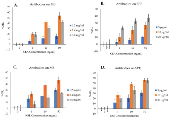 Other optimizations included optimizing the antibody concentration to attach to the MB (Figure 5A,C) for both CEA and NSE and the selection of the best concentration of Ab for the immobilization on the surface of SPGE for both analytes (Figure 5B,D).