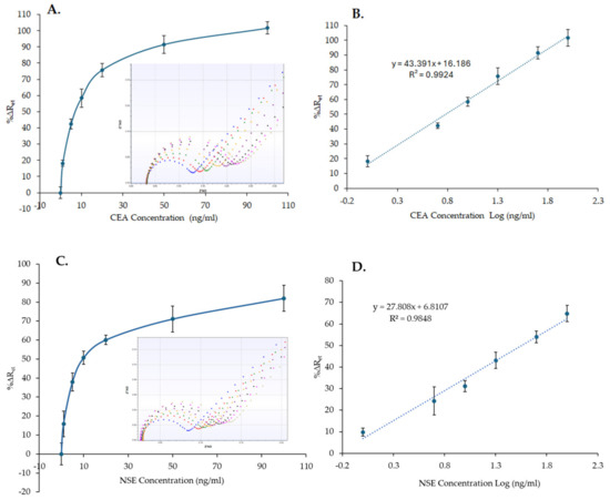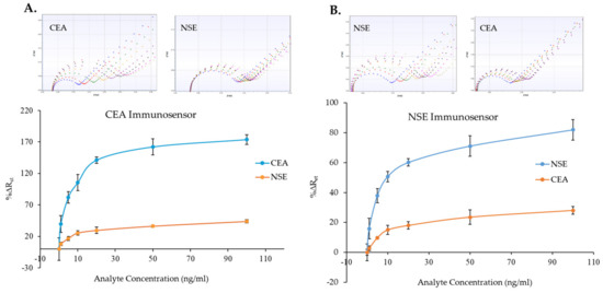 Several optimizations of the immunosensors were conducted to obtain high sensitivity and specificity. For these experiments, the immunosensors were prepared and tested with various NSE or CEA concentrations by the formation of a sandwich sensor on top of the functionalized SPGE. The EIS signals were then recorded, the Ret values were evaluated using the PStrace software, and the %∆Ret for each concentration was calculated as explained in the Materials and Methods, in Section 2.3. As shown by the results, the attachment of the MB–Ab–analyte to the antibodies immobilized on the SPGE reduces the electron transfer from the redox probe to the electrode, thus increasing the Ret values proportionally to the concentrations of the analyte.