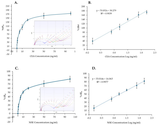 The %∆Ret and the CEA or NSE concentrations in logarithmic scale were used to plot the linear range of CEA and NSE immunosensors (Figure 7B,D). Linear curves with correlation coefficients of 0.9839 and 0.9977 and LoD values of 0.76 ng/mL and 0.52 ng/mL were obtained for CEA and NSE, respectively. Although the achieved LoDs are higher than the LoDs for both analytes in PBS, which were 0.26 ng/mL and 0.18 ng/mL, the values are lower than the clinical cut-off values of 5 ng/mL and 12 ng/mL for CEA and NSE, respectively, and are, therefore, clinically relevant.