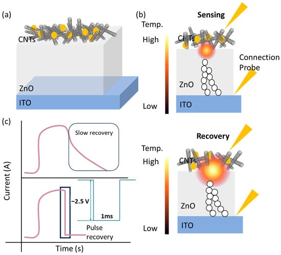 Schematic illustration of (a) en-APTAS-decorated CNTs-CFH gas sensor; (b) sensing mode in HRS; (c) pulse-recovery process. The pink line shows the schematics of transient response curve; the blue line shows a pulse with an amplitude of −2.5 V with a pulse width of 1 ms and recovery mode in HRS.