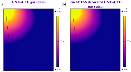 To evaluate the heating characteristics of the proposed CFH, heating profile was initially examined by using COMSOL Multiphysics 6.2 simulations. Heat generation in the CFH occurs in the HRS, where the maximum power dissipation occurs across the gap of ruptured CF due to the applied voltage. It is important to note that the CF is formed within the CFH through DC voltage sweeping in the positive bias region. Conversely, during the reverse operation, the CF ruptures due to Joule heating, particularly at the edge of the CF. This ruptured CF was utilized as the heat source in the COMSOL Multiphysics 6.2 simulations involving the CFH. The majority of the electric field is concentrated within the thin ZnO gap between the ruptured CF and the top electrode (TE), illustrating the electric field distribution when a Vsensing of 0.5 V is applied. This is one of the key outcomes of the simulation. Figure 2a,b present the simulated temperature distribution for the HRS of the CNTs-CFH gas sensor and the en-APTAS-coated CNTs-CFH gas sensor, respectively. In both cases, heat generated has the same value of 579 K. The reason to obtain the same temperature is due to the constant Vsensing of 0.5 V. Hence, the enhanced gas sensing response observed is mainly due to decoration of en-APTAS membrane on the surface of CNTs. In conclusion, the heating temperature generated in the CFH acts as a nano-heater for CNT gas sensors.