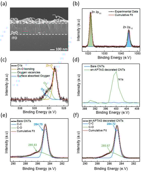 (a) Cross-sectional FE-SEM image of device. High-resolution XPS spectra of (b) Zn 2P and (c) O 1s from ZnO film. (d) XPS spectra of N1s peak with bare CNTs and en-APTAS-decorated CNTs; (e) XPS spectra of C 1s peaks of bare CNTs sample and (f) en-APTAS-decorated CNTs.
