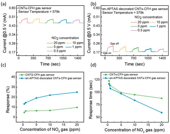 Measuring the gas sensing of the proposed gas sensors was performed by exposing the devices to the target gas while monitoring the change in the current value at a Vsensing of 0.5 V. The gas sensing measurements were performed in the HRS of both gas sensors. The HRS of the gas sensor corresponds to the high resistance state, which results in a high temperature inside the CFH. This high temperature will be used as a nano-heater to observe the enhanced gas sensor characteristics at room temperature. The gas sensing measurements were performed to evaluate the sensitivity of the proposed gas sensors towards different concentrations (20–0.5 ppm) of the NO2 gas. Figure 5a,b show the transient curve of the CNTs-CFH and en-APTAS-decorated CNTs-CFH gas sensors. The gas sensing results show the instant change in the current level as the target gas is injected into the chamber. The change in the current level resulted from the reaction between the surface of the CNTs and the NO2 gas. The change in the current levels of both the gas sensors showed a direct relation with the concentration of NO2 gas. Equation (1) is used to calculate the response percentage of the gas sensor. The calculated response percentage of the CNTs-CFH gas sensor and the en-APTAS-decorated gas sensor is shown in Figure 5c. The response of the en-APTAS-decorated CNTs-CFH gas sensor is observed to be higher than that of the CNTs-CFH gas sensor at all concentrations of NO2 gas. Figure 5d shows the response time plot of CNTs-CFH and en-APTAS-decorated CNTs-CFH gas sensors for all the concentrations of NO2 gas. The response time increases with the decrease in the concentration of NO2 gas, which is due to the low diffusion rate and slow reaction at low concentrations of NO2 gas with the CNTs. The response time of the en-APTAS-decorated CNTs-CFH gas sensor is observed to be faster than that of the pure CNTs-CFH gas sensor, which again confirms that the modified CNTs surface offers more reaction sites and high reactivity towards NO2 gas.