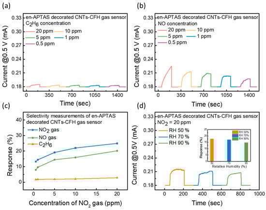 To further check the superiority of the proposed en-APTAS-decorated CNTs-CFH gas sensor, selectivity measurements were performed towards NO and C2H6 gases, as shown in Figure 6a,b. In addition to NO, C2H6 gas was chosen for the selectivity measurements because it is a representative gas of the hydrocarbon group. C2H6 is extensively used in industries for the development of plastic materials [30] and it is also present in exhaled human breath [31]. Thus, detection of C2H6 gas extends the detection capabilities of the proposed en-APTAS-decorated CNTs-CFH gas sensor. Selectivity measurements were performed with 20–0.5 ppm of the target gases. Furthermore, a comparison of response percentages for NO2, NO, and C2H6 is shown in Figure 6c. The en-APTAS-decorated CNTs-CFH gas sensor showed the lowest response towards C2H6 gas due to its low adsorption energy. CNTs-based gas sensors have frequently been utilized for the detection of NO gas. However, the en-APTAS-decorated CNTs-CFH gas sensor showed a significantly high response towards NO2 compared to NO gas. The increase in the response towards NO2 gas is related to the larger kinetic diameter of NO2 gas, which is reported to be 3.83 Å [32,33]. Due to the larger kinetic diameter of NO₂ gas, it tends to have stronger interactions with both CNTs and en-APTAS. These results show the superiority of the selectivity measurements of the sensor towards NO2 gas. The effect of relative humidity (RH) was evaluated by increasing the RH level. Figure 6d shows the transient gas sensing curves of the en-APTAS-decorated CNTs-CFH gas sensor at 20 ppm of NO2 gas by maintaining an RH range of 50–90%. The response percentages at different RH levels are plotted in the inset of Figure 6d, indicating a 39% degradation in the response percentage at 90% RH as compared to the response percentage at 30% RH. The en-APTAS-decorated CNTs-CFH gas sensor showed fairly stable response characteristics due to the heating provided by the CFH at a Vsensing of 0.5 V at an elevated RH level. These results suggest that heating the CNTs using CFH provided resistance in the adsorption of water molecules and validated the stability of the en-APTAS-decorated gas sensor towards a high RH level.