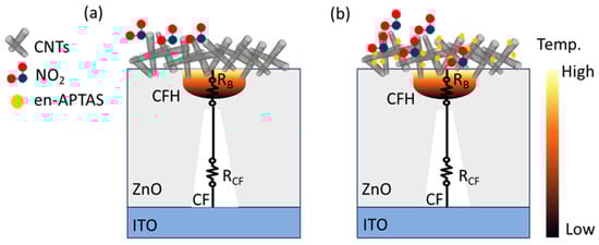 The gas sensing mechanism of the CNTs-CFH gas sensor operates through charge transfer when NO₂ molecules are adsorbed and desorbed onto the sensor’s surface. Prior to performing the gas sensing measurements, the HRS of the CFH was achieved by rupturing the CF. When a negative voltage is applied, the CF ruptures due to the Joule heating effect. At the HRS, two types of resistances appear inside the CFH, i.e., (i) resistance of the ruptured CF (RCF) and (ii) resistance of the bulk (RB), which appeared at the gap of the ruptured CF. On the application of a sensing voltage of 0.5 V, maximum power dissipation occurs at the bulk resistance (RB), resulting in an increase in the heat. This generation of heat is used as a nano-heater to observe the gas sensing characteristics at RT. Figure 7a,b show the interaction of the NO2 gas with the CNTs and the en-APTAS-decorated CNTs. Due to their natural abundance of holes, CNTs function as p-type semiconductors, while NO2, being an excellent oxidizing agent, tends to capture electrons [39]. In ambient conditions, oxygen interacts with the CNT surface, capturing an electron and creating an depletion layer on the CNT surface. The removal of electrons from the CNT surface increases the number of holes, which facilitates electric current conduction. When the CNTs are exposed to NO₂ gas, the chemisorbed ions react with NO₂ gas molecules, leading to the formation of numerous species. These reactions can typically be described as follows [40]: