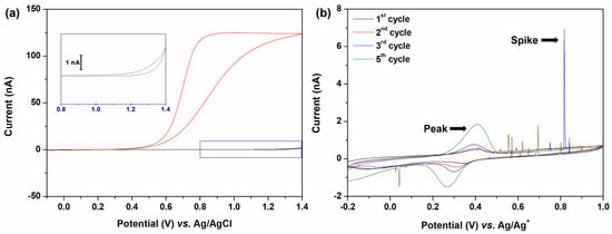 The oxidative current increased again in the background electrolyte solution when the potential exceeded 1.2 V (vs. Ag/AgCl). This was attributed to oxidation of the solvent (i.e., H2O). However, in the DA solution, the oxidation of the solvent was not observed at the same potential of 1.2 V, which was attributed to the local pH decrease.