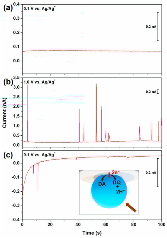 To precisely measure the single-droplet information, constant potentials were applied to the electrode rather than using the potential sweep method. Sequential measurements at constant potentials were performed. Figure 2 shows the double-potential step chronoamperometry, alternating between reductive (0.1 V vs. Ag/Ag+), oxidative (1.0 V), and reductive (0.1 V) potentials to quantitatively analyze the anodic and cathodic current spikes. No spike signal was observed when a reduction potential was applied after the fresh DA droplets were injected. This observation confirmed that the DA droplets did not contain reducible species. Therefore, it can be suggested that the anodic collision spikes in Figure 2b correspond to DA oxidation, and the cathodic collision spikes in Figure 2c correspond to DQ reduction.