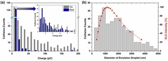 Figure 3a shows the distribution of spike charges obtained from double-potential step voltammetry, which comprised 430 oxidative current spikes and 157 reductive current spikes. The observed reductive collision frequency in Figure 3a was lower than the oxidative collision frequency. The frequency difference could be attributed to the considerably smaller number of DQ droplets generated by the collision compared with the DA droplets. The average charge values of oxidative and reductive collisions were 129.49 and 8.33 pC, respectively; the average charge ratio, QOx/QRed, was 15.5. The relatively smaller charge of the DQ droplet may be attributed to the chemical reaction that proceeded in the droplet until it collided with the UME, although cyclization was retarded by the pH adjustment. In Figure 3b, the calculated droplet size distribution derived from Equation (3) using anodic collision data matches well with that obtained from dynamic light scattering (DLS), indicating the validity of the electrochemical size measurement.