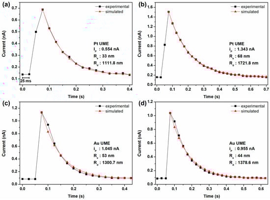 Single anodic current spikes from i–t curves with 100 mM TBAPF6 in DCE with emulsion droplets containing 50 mM DA and 50 mM MgSO4. The experiments were conducted using different working electrodes. Panels (a,b) employed Pt UME, while panels (c,d) used Au UME. The experimental data (black) and the simulated decay curves (red) are illustrated.