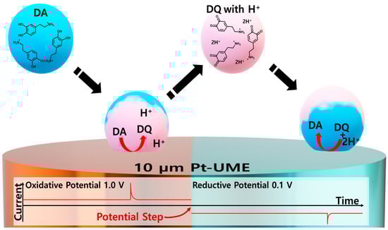 Dopamine (DA), a neurotransmitter extensively studied for its multifaceted roles in various diseases, is the focus of this study [1,2]. Abnormal concentrations of DA in biological systems can manifest in various diseases (e.g., Parkinson’s), making it a critical diagnostic indicator [3]. The DA detection method has been studied for decades for selective analysis, excluding interfering species (e.g., ascorbic acid and uric acid) owing to redox potential overlap [4,5,6]. Although the precise electrochemical mechanism underlying the oxidation of DA through proton-coupled electron transfer (PCET) has not been completely elucidated [7], several methods have been developed to enhance detection sensitivity [8,9]. Over the years, researchers have modified ultramicroelectrodes (UMEs) to improve sensitivity and selectivity, as detailed in Table 1. However, in a real system, DA is contained inside a synaptic vesicle; therefore, a detection system for dopamine inside a single vesicle is required [10].