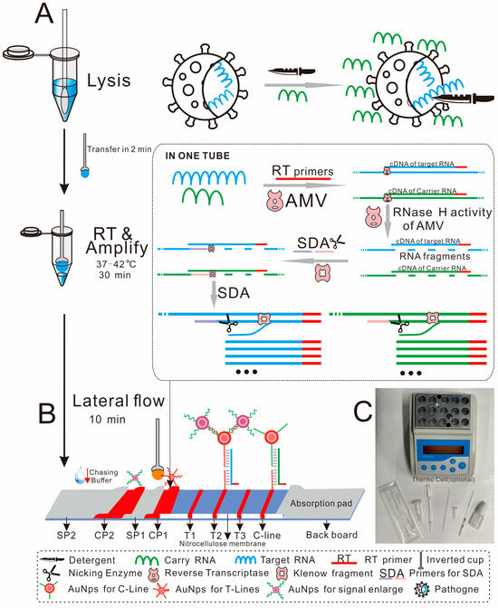 The samples were lysed by the lysis buffer (0.2% triton X-100, 0.5% NaCl, 0.2 μg/μL Carrier RNA) to release RNAs. Carrier RNA can slow down the degradation of target RNAs. The yielded solution was then transferred to an enzyme mixture, where the AMV enzyme synthesized the cDNA of the target region and removed the RNA from the cDNA/RNA complex, which created the binding sites for SDA primers; the resulting single-stranded cDNA was then used as a template for single-direction isothermal strand displacement amplification. The yielded ssDNA was further detected by a lateral flow biosensor (Figure 1). The added carrier RNA was also amplified by the same enzyme mixture with different primers as a quality control, and the yielded ssDNA of carrier RNA was captured by the probes in C-line. Thus, a convenient on-site diagnostic biosensor for ssRNA of pathogens was established.