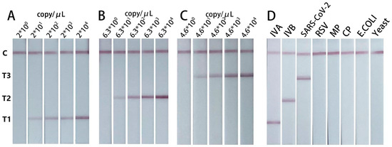 Primary experiments were carried out using inactivated virus or swab eluent. Figure 3 shows typical photos of the results. Red test lines are observed in the presence of the corresponding virus. No test line is observed in the absence of the target virus, and no line is observed in the absence of enzymes. All the reagents and probes used in the enzyme mixture do not affect the specificity of these biosensors. The results show that this biosensor worked well in ssRNA detection.