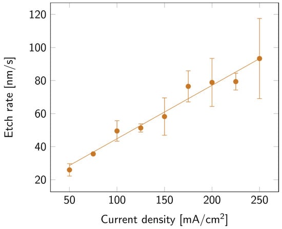 SLIM was used to extract the thickness and porosity of the porous layers. The values of the layer thickness were then verified via cross-section SEM measurements. To compare all samples, the collected data were expressed in etch rate instead of thickness. As can be observed in Figure 2, the higher the current density, the faster the etch. This variation appears to be linear with the current density.