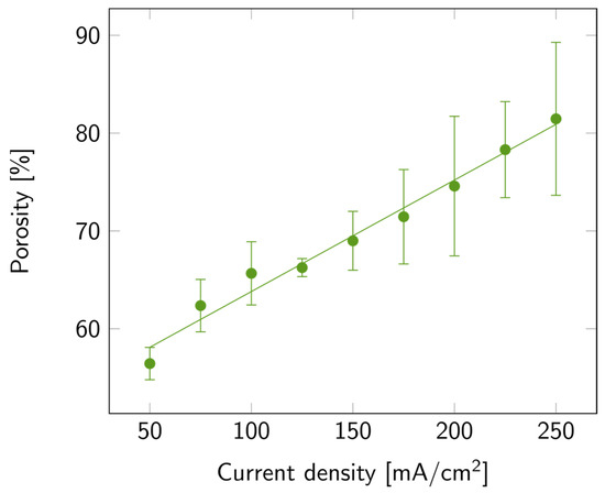 The variation in porosity with current density is illustrated in Figure 3, where a linear increase in porosity with current density is also observed. The maximum average value of porosity was 81%, but samples with up to 90% porosity were measured. The increasing trends of both porosity and etch rate with current density matched the trends previously reported [35]. To explain this trend, one must consider the processes involved in the porosification, among which is the anodic oxide formation and further dissolution in HF-based electrolytes. This process occurs mainly at high current densities [33,35]. Furthermore, the accelerated etch rate may also be linked to the increased rate of silicon anodic dissolution, the enhanced transport of electrolyte to the silicon surface, and the increased concentration of electroactive species [34,35,36].