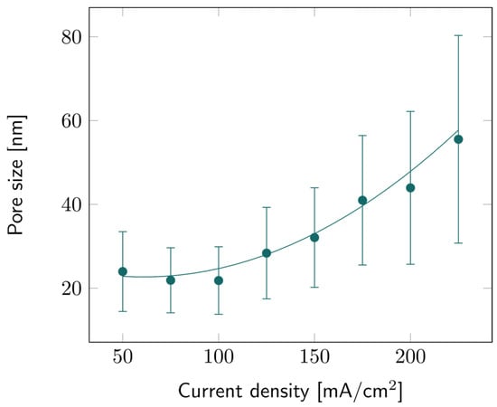 The pore sizes of all PSi samples were characterized based on SEM observations. Image analysis provided data about the average pore size for all current density values, as illustrated in Figure 4. Like porosity and etch rate, the average pore diameter increases with the current density, but the trend is more quadratic than linear. Similar trends have been observed before as well [35]. The large error bars indicate that there is a large pore size distribution, as can also be observed in Figure S3. It can also be noted that the higher the current density, the broader this distribution: while the average pore size for 225 mA/cm2 was ~55 nm, larger pores could be observed, up to 80 nm for some samples.