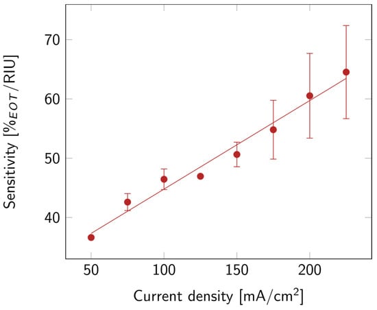 Finally, the optical sensitivity of the layers was studied. The sensitivity, shown in Figure 5, increased with current density. This might be linked to the increase in porosity. Indeed, the higher the porosity, the more filling material was able to penetrate the layer, and the more it affected the EOT. A summary of all the properties discussed above is available in Table S1.