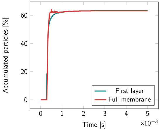 Percentage of the accumulated particles inside the full membrane and inside the first layer of the 2D microcavity over time. The particles were released at the top of the upper fluidic channel at t = 0.