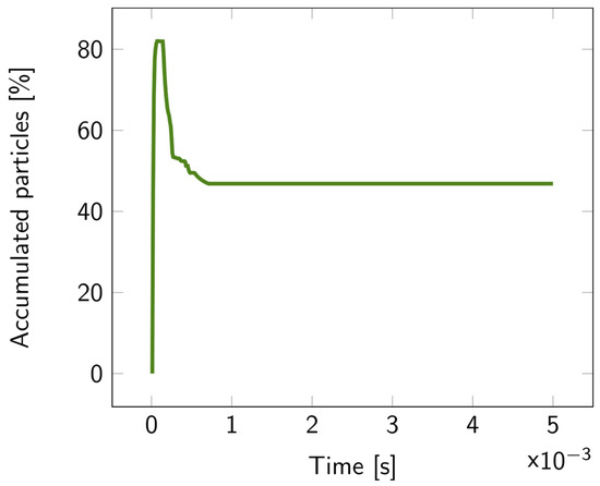 Percentage of the accumulated particles inside the first layer of the 2D double layer overtime, with parameter diff = 20 nm. The particles were released at the top of the upper fluidic channel at t = 0.