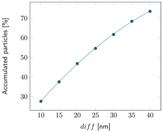 For the 2D double-layer model, the particle tracing over time is illustrated in Figures S9–S11. The percentage of accumulated particles in the first layer is depicted in Figure 7. About 50% of the bacterial fragments were retained when the average pore diameter of the second layer was decreased by 20 nm compared to the first layer. This percentage increased even more for larger reductions in pore size, exceeding 70% for a 40 nm difference, as illustrated in Figure 8.