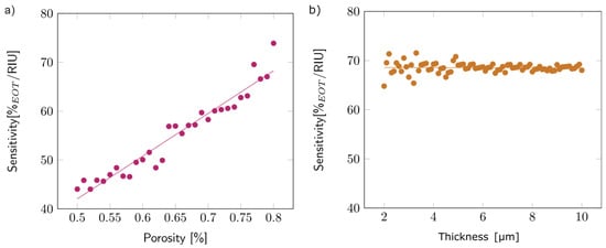 Once the model was validated (see Figures S12 and S13), the first step of the study concentrated on the first layer, simulated as a single layer surrounded by air. To analyze the effect of porosity on sensitivity, the thickness of the layer was arbitrarily fixed at 5 µm, and the porosity varied between 50 and 80%. Figure 9a depicts the observed variation: sensitivity increased with porosity. This trend can be explained by the higher volume of filling media present inside the porous layer for higher porosities, which increased the overall layer refractive index. The linear variation was similar for other layer thicknesses.