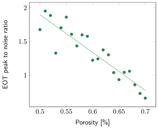 The impact of the porosity of the second layer was studied over a range from 50 to 70%. The layer thickness was arbitrarily fixed at 10 µm. Variations in porosity did not impact the sensitivity significantly (Figure S14). To study the contrast between the first and second layers, the intensity of the EOT peak was compared to the surrounding noise, which was approximated using the standard deviation of the signal. The higher the EOT peak, the more easily it was picked out and fitted using the RIFTS routine. The peak to noise ratio for a filling medium with refractive index n = 1.3 (water), for different contrast layer porosities, is detailed in Figure 10. It can be observed that the lower the second layer’s porosity, the higher the peak to noise ratio.