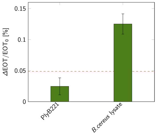 Relative EOT shifts measured on PSiMs for bacterial lysis detections: control test with only PlyB221 endolysin and shift measured when lysing a 106 CFU/mL B. cereus suspension (n ≥ 3). The dashed red line represents the 3σ level of the signal measured in PBS.