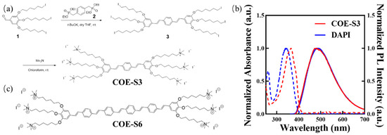 The COE-S3 molecule, featuring a backbone of three benzene rings and six terminal polar ionic pendants, was synthesized as detailed in Figure 1a, with comprehensive procedures and structural characterizations available in the Supporting Information (Figures S1–S3). Briefly, the oligo-phenylenevinylene backbone was constructed through the Horner–Wadsworth–Emmons reaction, where tetraethyl p-xylylenediphosphonate (Compound 2) reacted with an excess of 3,4,5-tris((6-iodohexyl)oxy)benzaldehyde (Compound 1, synthesized as per previous literature [23]) to form the neutral precursor 3. Subsequently, COE-S3 was obtained as a yellow powder following quaternization with an excess of trimethylamine solution in a 3/chloroform mixture, stirred at room temperature, and then purified by solvent removal under vacuum [23]. In aqueous solution, COE-S3 displayed maximum absorption at 366 nm and maximum emission at 476 nm, as shown in its UV–Vis absorption and fluorescence spectra (Figure 1b). Its spectral properties were similar to those of DAPI, and its molecular structure bore resemblance to the previously reported COE-S6 molecule (Figure 1c). Notably, COE-S3’s large Stokes shift (∆λmax ≈ 100 nm) effectively minimizes self-absorption. The fluorescence quantum yield of COE-S3 in deionized water was determined to be approximately 0.80, using DAPI as the reference (QYDAPI = 0.043) [34].