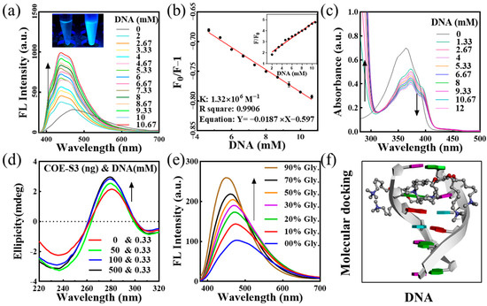 Viscosity tests, involving the gradual addition of glycerol to water/glycerol mixtures, were conducted to examine the relationship between the free rotational space of COE-S3 molecules and their fluorescence response. The fluorescence intensity of COE-S3 was found to be directly proportional to the solution’s viscosity (Figure 2e), supporting the hypothesis of an intercalative binding mode. Intercalation binding to DNA typically increased the mixture’s viscosity due to the enlargement of gaps between adjacent base pairs. In contrast, electrostatic and groove binding modes had a minimal impact on viscosity [47,48].