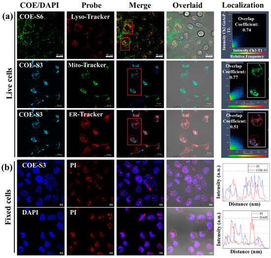 Cell culture was conducted under standard conditions at 37 °C in a humidified atmosphere with 5% CO2. The culture medium was supplemented with 10% (v/v) fetal bovine serum and 1% (v/v) penicillin-streptomycin. Cells grown on confocal petri dishes to a density of 70% were pre-treated as required for subsequent imaging. Fixed cells were prepared using 4% paraformaldehyde at room temperature for 10 min, followed by two PBS washes. Apoptotic cells were obtained from cells subjected to 72–96 h of serum starvation. For imaging, the treated samples were co-stained with COE-S3 and PI, each at 1 μM for 30 min, and then immediately imaged using confocal microscopy. In organelle localization experiments, live cells were pre-incubated with 1 μM COE-S3 (or COE-S6) for 4 h, followed by staining with Mito-tracker and Lyso-tracker probes for 45 min each. The colocalization coefficient was calculated post-confocal microscopy imaging, and the distribution of fluorescence curves was analyzed using Origin 8.0 software.
