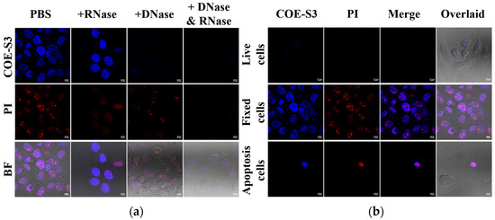 To confirm the specific binding of COE-S3 to intracellular DNA and to rule out nonspecific interactions with RNA, a nuclease digestion assay using both RNase and DNase was performed. This assay aimed to validate the selective affinity of COE-S3 for DNA within cells. Cells pre-stained with COE-S3 were treated separately with PBS, DNase, and RNase. Remarkably, the fluorescence intensity of COE-S3 markedly diminished following DNase treatment, indicating DNA degradation, whereas RNase treatment, which degrades RNA, did not affect the fluorescence intensity (Figure 4a). These findings were corroborated in control experiments: DNase treatment reduced the blue fluorescence of DAPI, a DNA-specific dye, and RNase treatment eliminated the deep red fluorescence of PI from the nucleolus, as shown in Figure S9. The pronounced selectivity of COE-S3 for intracellular DNA eliminates the need for RNase pre-treatment, a step often required for commercial DNA probes such as ethidium bromide, thiazole orange homodimer, and SYTO dyes [38].