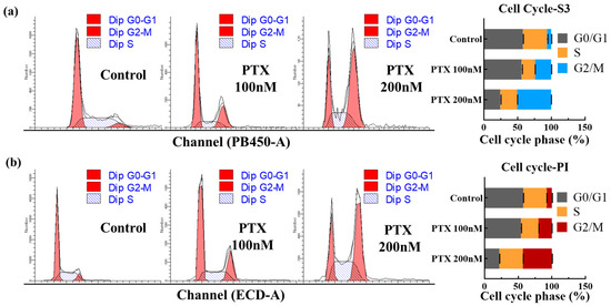 Cell cycle analysis with COE-S3 and PI. (a) Quantitative assessment of cell cycle phases in three groups using COE-S3. (b) Quantitative assessment of cell cycle phases in three groups using PI. Analysis includes normal cells, and cells treated with 100 nM and 200 nM PTX over 24 h. Data processed using ModFit 5.0 software. Results are presented with mean standard deviation (±S.D.).