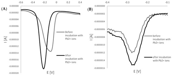 Examples of square-wave voltammograms (cathodic scans) were obtained for macro (A) and miniaturized electrodes (B) before and after incubation with lead ions.