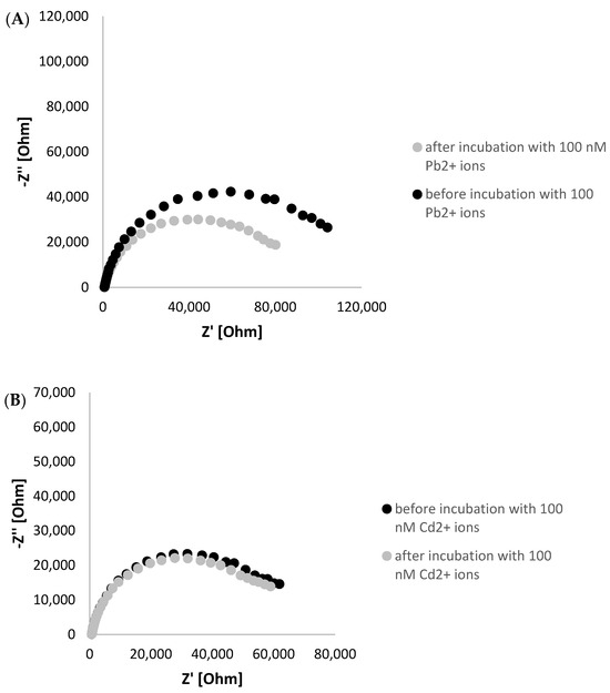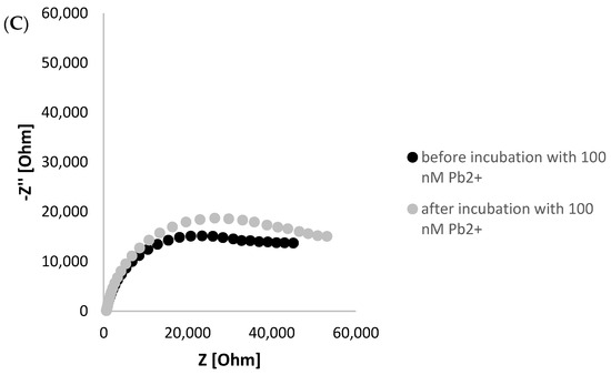 To further confirm the possibility of G-quadruplex formation, electrochemical impedance experiments were executed in the presence of ferri/ferrocyanide redox couple as a source of aptasensor response. As seen in Figure 3A in A Nyquist plot, a Ret decrease was observed after incubation of TBA/MCH-based layer with 100 nM lead ions. This evidenced the rearrangement of the G-rich aptamer sequence into a layer of a smaller thickness, leading to a smaller distance between the ferri/ferrocyanide redox indicator that enables more efficient charge transfer between the redox indicator and electrode surface. On the contrary, a minor Ret decrease was recorded when TBA/MCH-based miniaturized electrode was incubated with 100 nM Cd2+ ions, which might be justified by partial reduction of overall aptamer layer negative charge through binding with cadmium ions (Figure 3B). This might slightly enhance the attraction of ferri/ferrocyanide redox indicator to the receptor layer. Furthermore, a formation of G-quadruplex is unique for guanine-rich sequences as for polyT/MCH-based layer; a slight increase in charge transfer resistance was observed after incubation with 100 nM Pb2+ ions, as seen in Figure 3C. This indicates that there are interactions between aptamer strands within the layer, resulting in a steric hindrance for redox indicator and less efficient charge transfer.